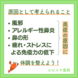 副鼻腔炎になる原因としては、風邪や花粉症などのアレルギー性鼻炎の他、虫歯、疲れやストレスによる免疫力低下が考えられます。