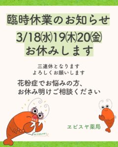 2026年 3/18㈬~20㈮まで臨時休業となります。